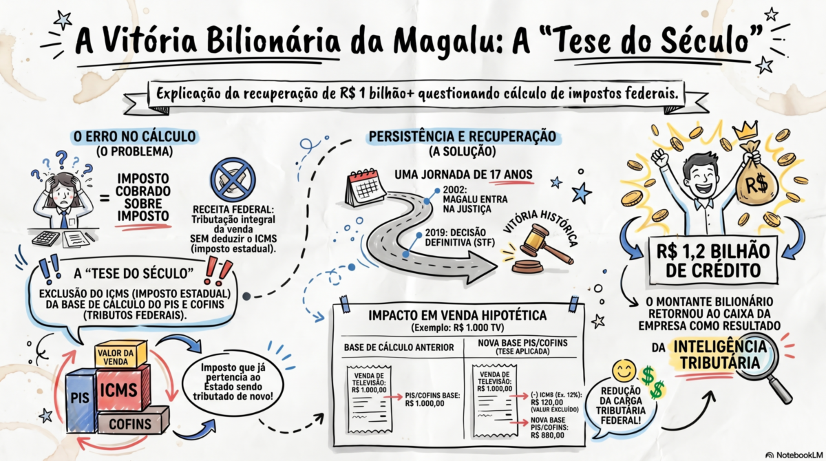 A rede varejista Magazine Luiza conseguiu recuperar mais de R$ 1 bilhão após uma longa disputa judicial contra o governo brasileiro. A empresa contestou a cobrança de tributos federais que incidiram sobre valores já pagos como impostos estaduais, o que considerou indevido.
